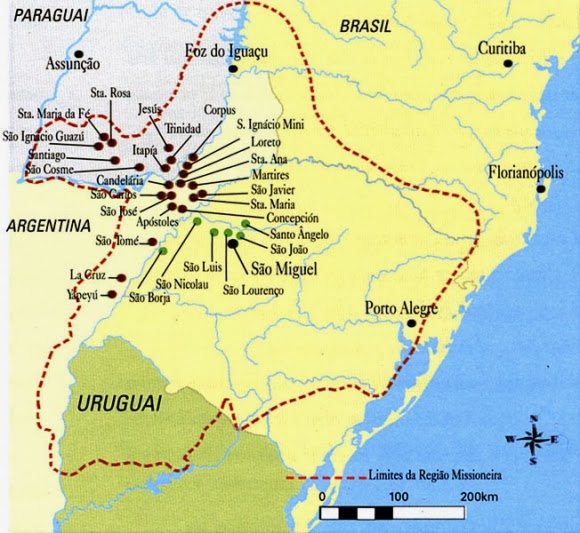 마드리드 조약 이후, 파라나 강과 우루과이 강 사이 미시오네스 동부 지역이 포르투갈령으로 넘어갔다. 그곳에는 예수회(Society of Jesus)가 세운 과라니족 선교 공동체 일곱 곳이 있었고, 이 마을들은 스페인 식민 정책에 따라 운영되는 레두크시온(reducción)이었다. 이 체제는 원주민을 정착시켜 공동 생산, 종교 교육, 기초 교육, 내부 자치, 방어 체계까지 갖춘 집단 공동체로 만드는 것이었다. 과라니 선교구는 교회와 학교, 창고, 농지, 주거지 등이 체계적으로 구성되어 있었고, 구성원들은 일정한 자율성과 공동의 책임 아래 생활했다.